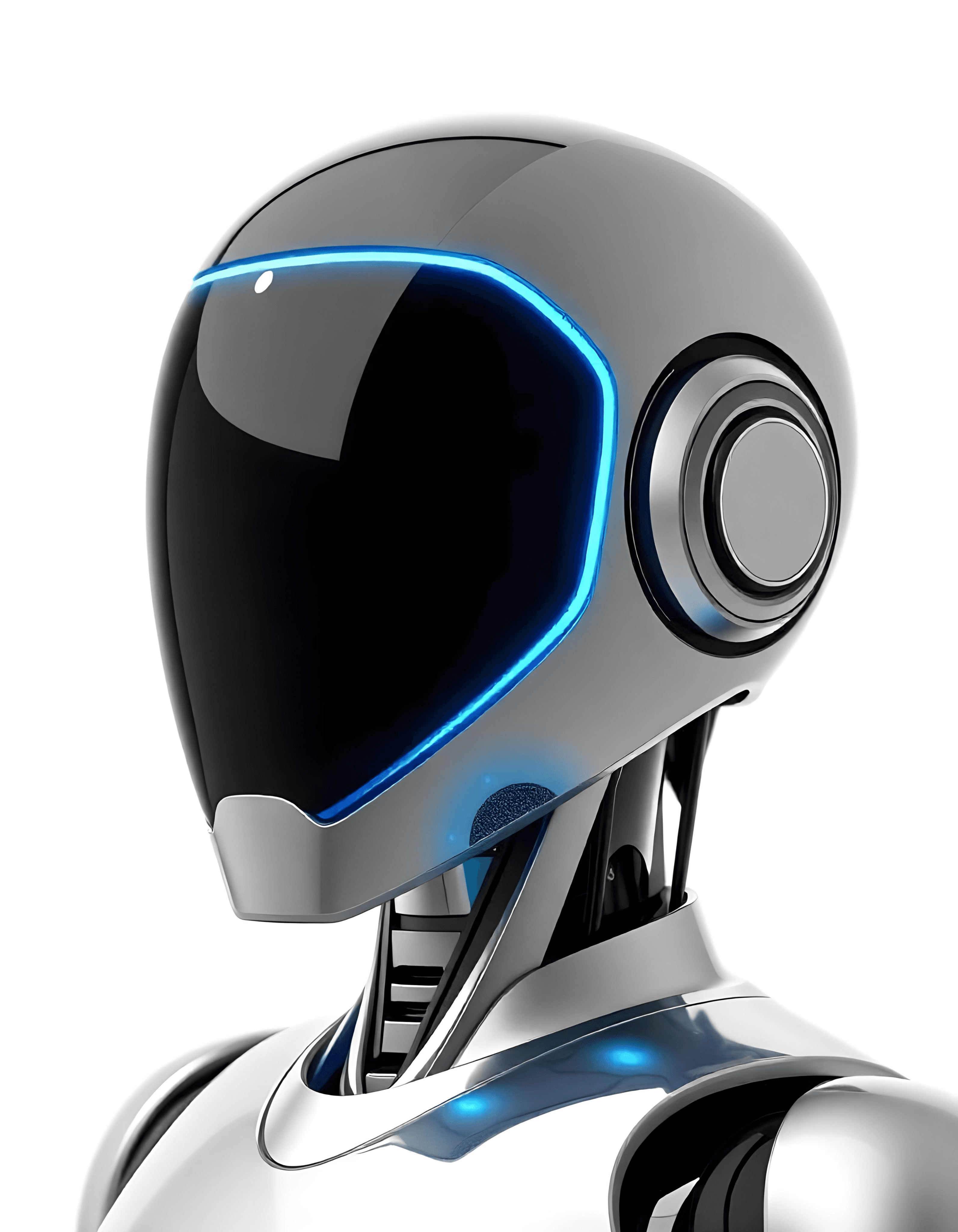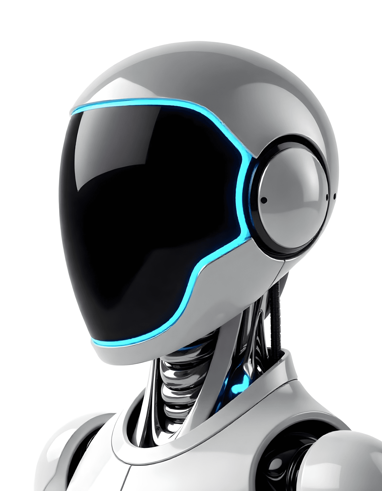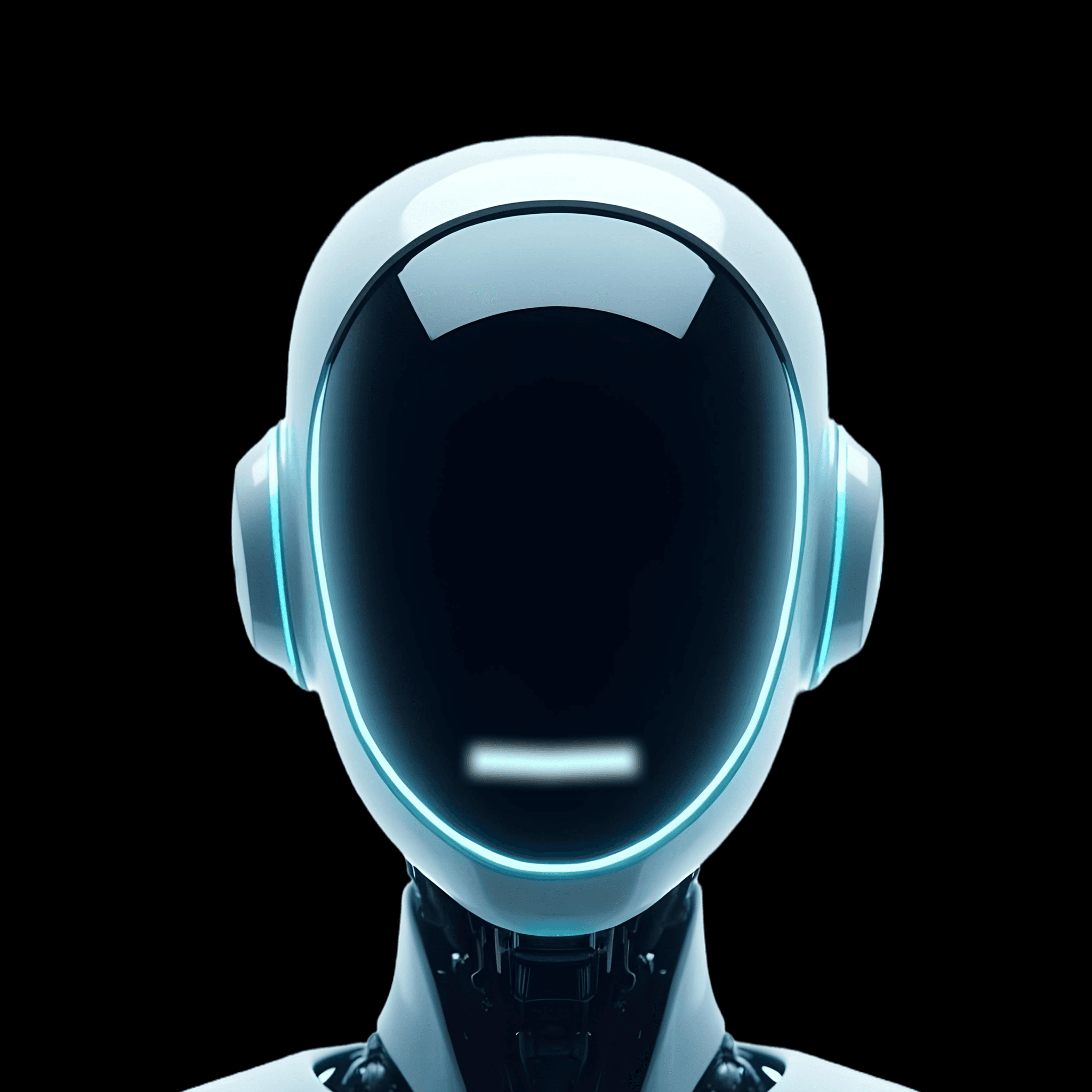 A three-quarter view of a futuristic robot resembling Tesla robots, focusing on simplicity. The robot's face is a smooth black glass panel with a sleek, reflective surface, surrounded by a glowing neon blue outline. The robot's shoulders and upper torso are minimalist in design, with smooth metallic surfaces. The background is pure white, creating a clean and modern aesthetic.