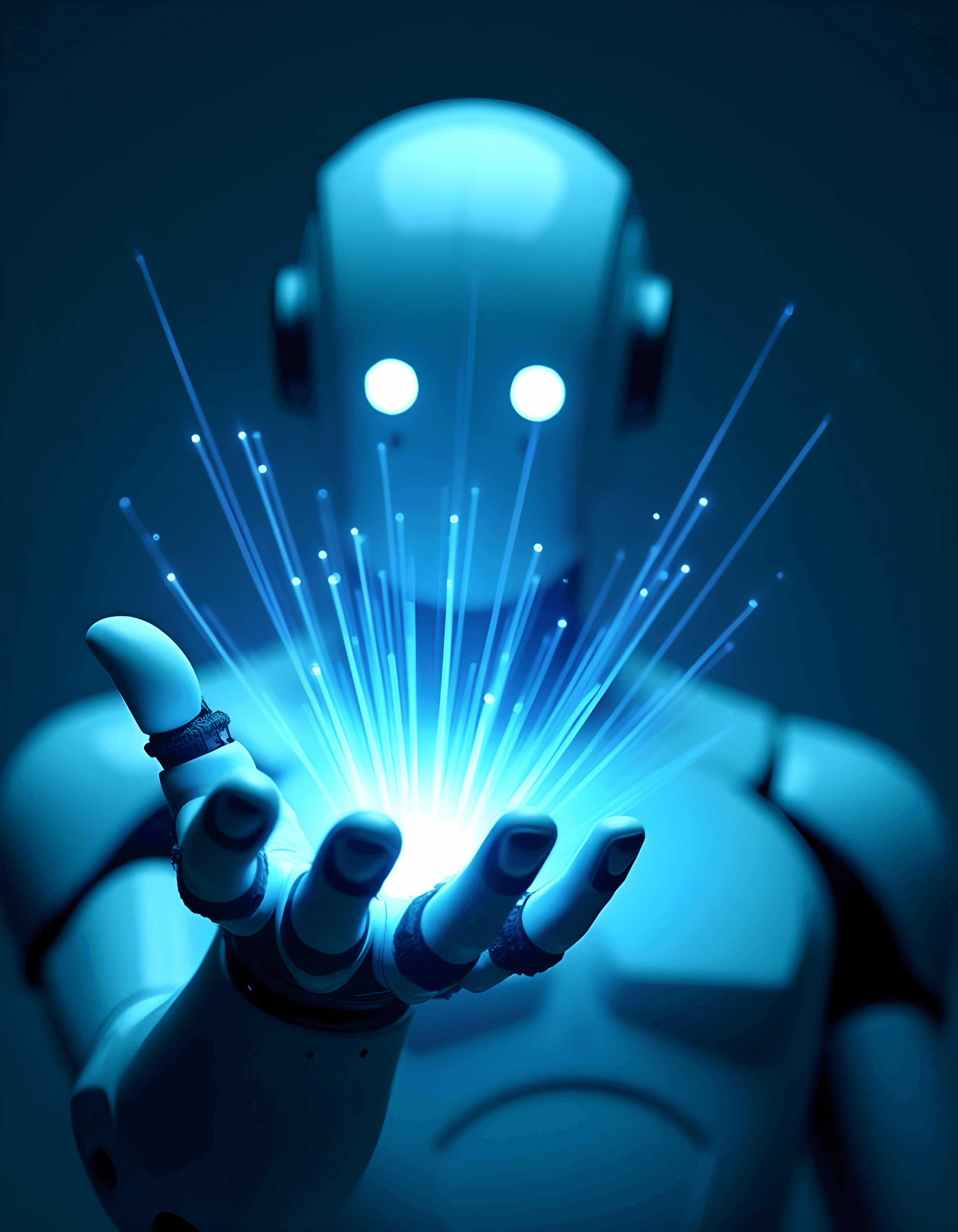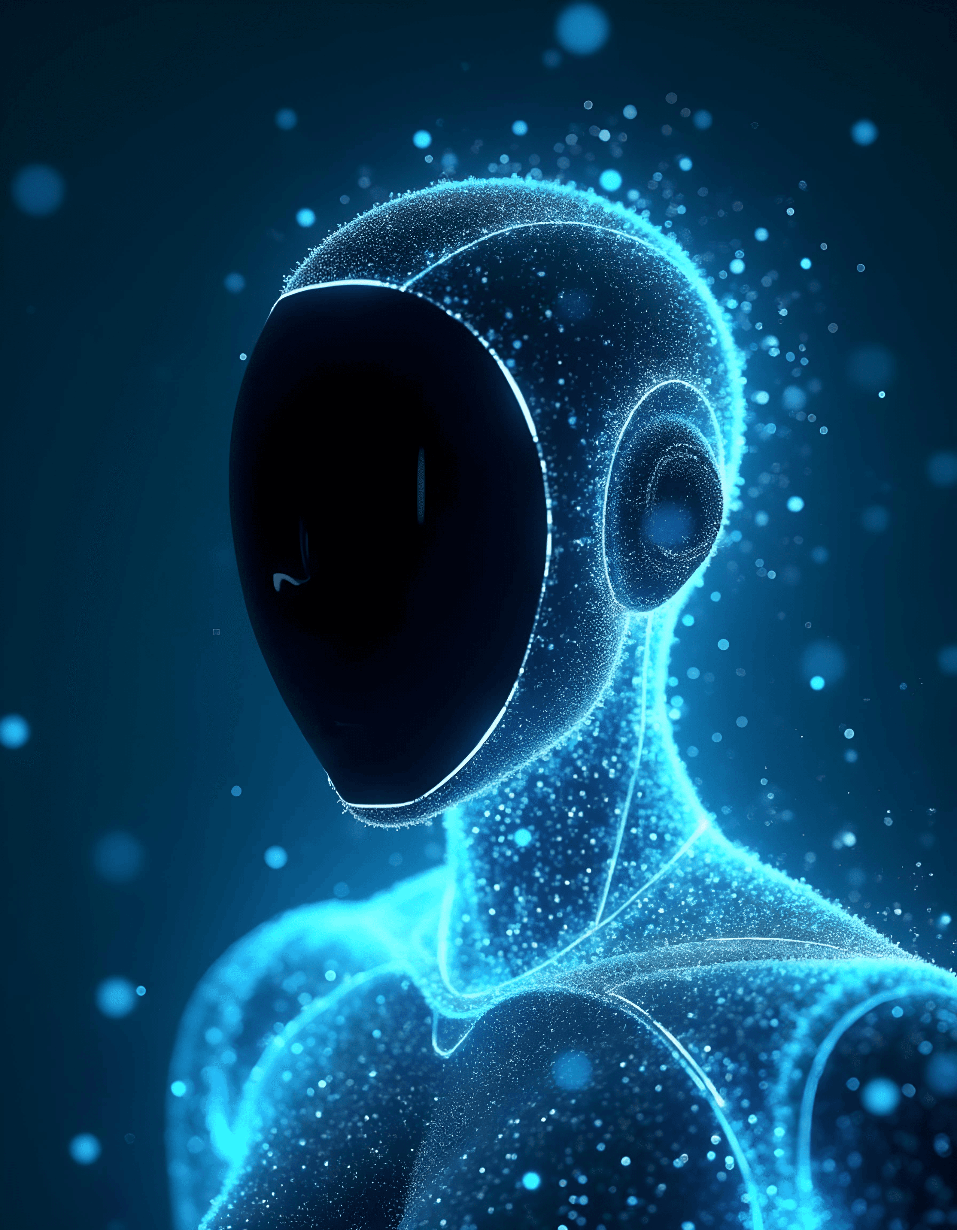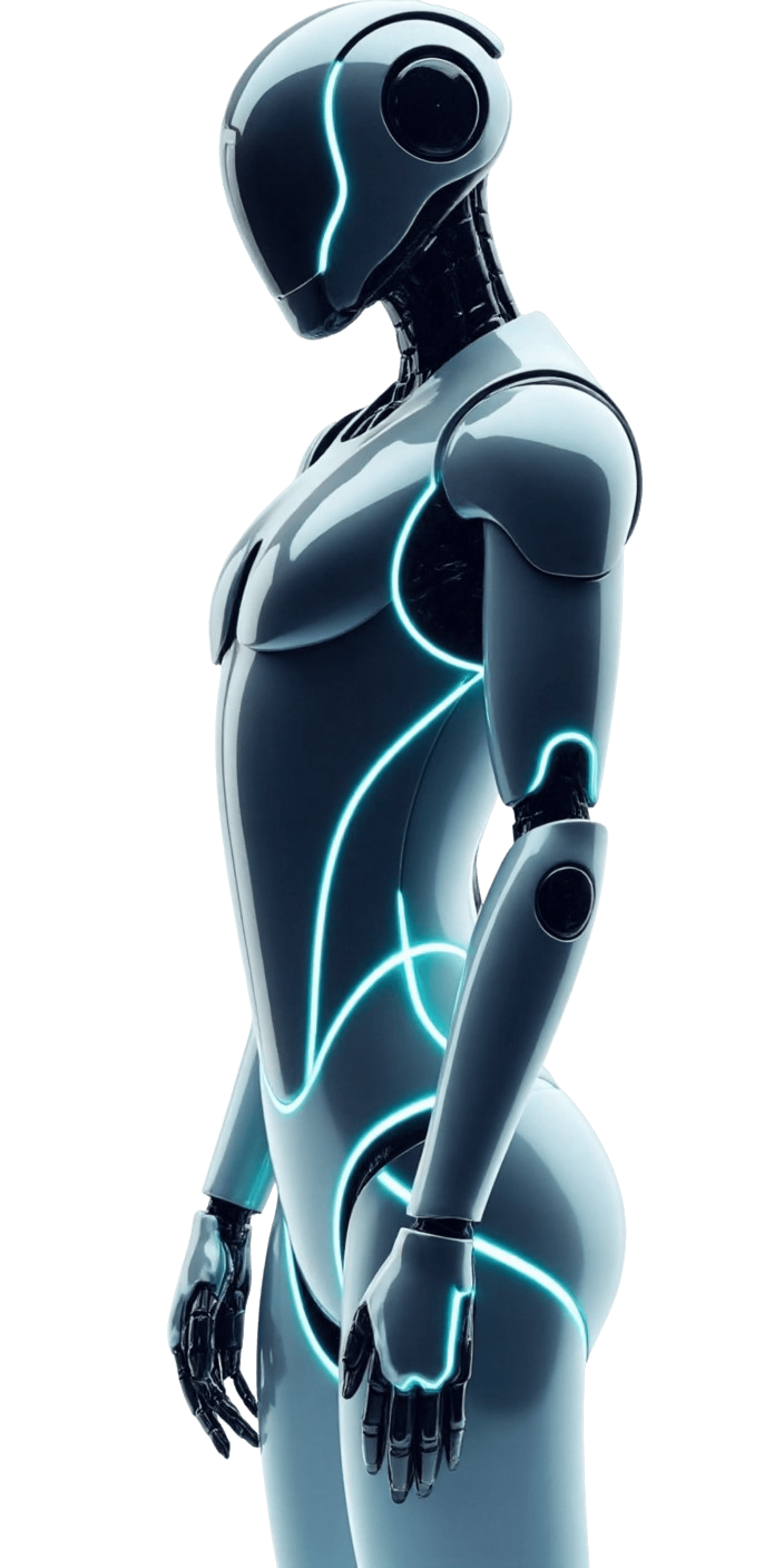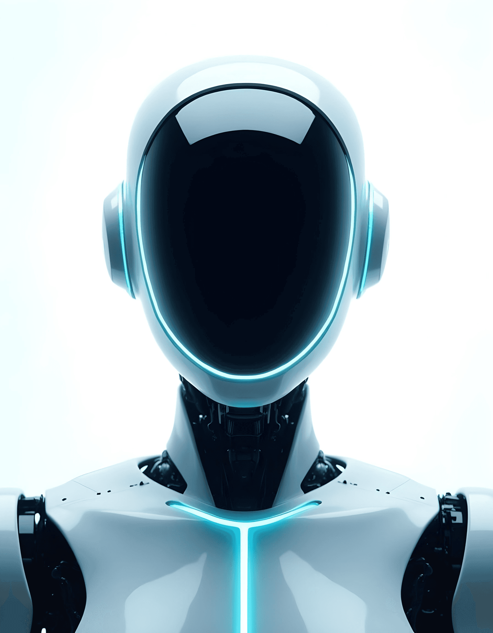 A three-quarter view of a futuristic robot resembling Tesla robots, focusing on simplicity. The robot's face is a smooth black glass panel with a sleek, reflective surface, surrounded by a glowing neon blue outline. The robot's shoulders and upper torso are minimalist in design, with smooth metallic surfaces. The background is pure white, creating a clean and modern aesthetic.