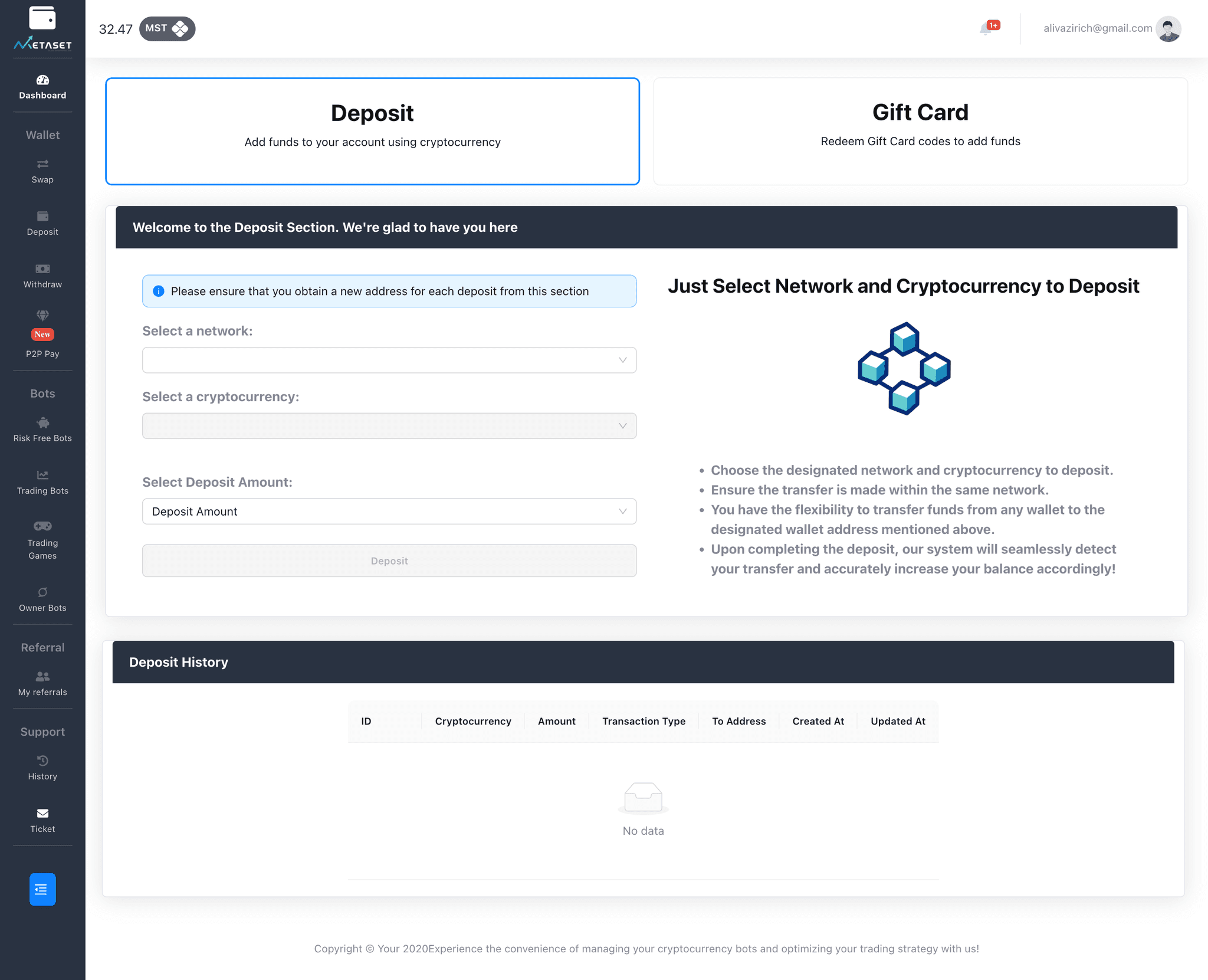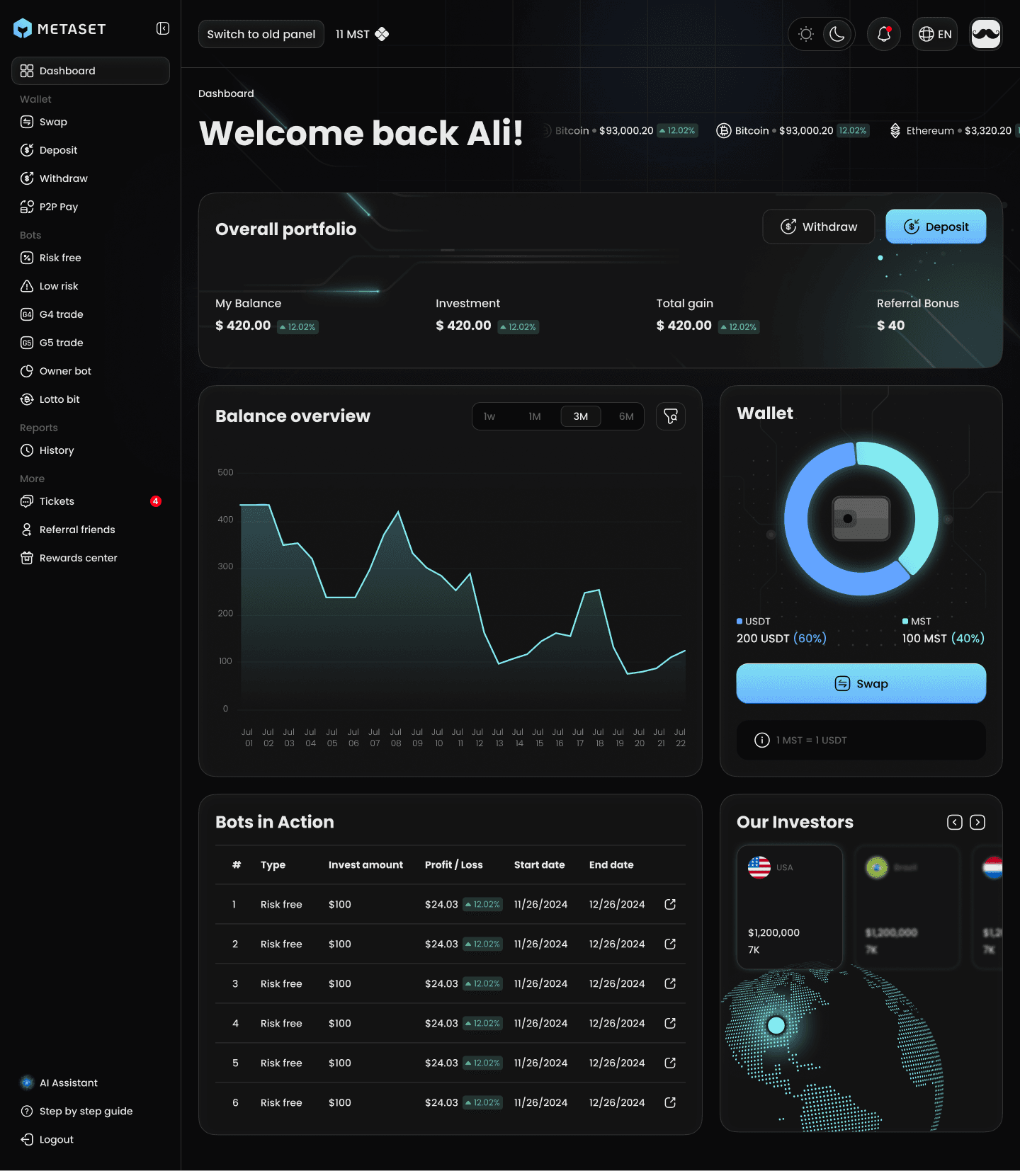 In this section, you can view and manage all of your digital assets. Your wallet acts as a secure storage for your cryptocurrencies. This is where you can check your balances and make new transactions